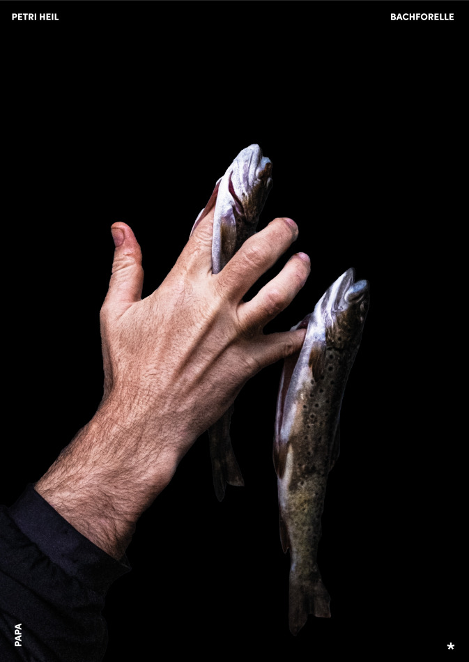 Die beiden Plakate stehen im Dialog miteinander. Die Hand meines Vaters. Meine Hand. Zwei Bachforellen. Wir halten stolz die Fische nach unserem erfolgreichen Fang in die Kamera. Ein Arrangement von vierLebewesen. Papa und ich verbringen nun mehr Zeit miteinander. Wir haben ein gemeinsames Projekt, ein gemeinsames Ziel. Wir angeln, wir unterhalten uns, wir töten die Fische, entfernen ihre Innereien und stehen im Fluss. Meine kognitive Dissonanz bezüglich des Töten und Verzehren eines Tieres verschwindet langsam. Es tut gut, sich wieder Zeit füreinander zu nehmen, nicht nur abends erschöpft vom Tag, sondern gemeinsam am Flussufer zu stehen. Petri Heil oder Hetri Peil! Ich wünsche uns einen guten Fang.