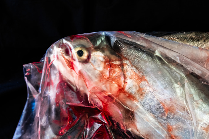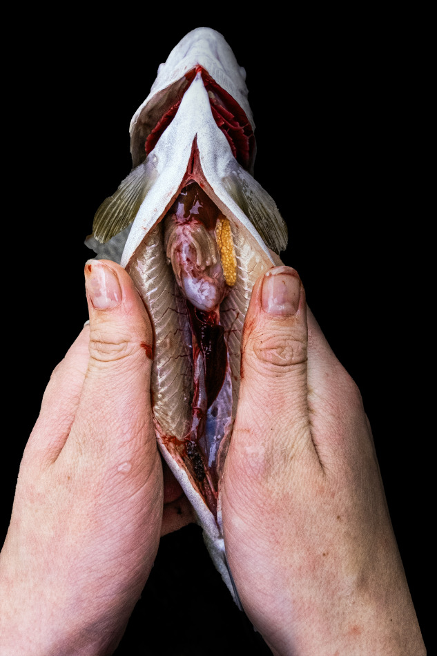 Doch nun zu den Fischen: Lisa Björk (HETRI PEIL) reflektiert in ihrer Arbeit ihr Verhältnis zum Fleisch- bzw. Fischkonsum. Sie spricht von der kognitiven Dissonanz: Wir lieben das rechteckige, sauber verpackte Stück Fleisch, und wir verdrängen die oft rücksichtlose Massen-Tierhaltung.